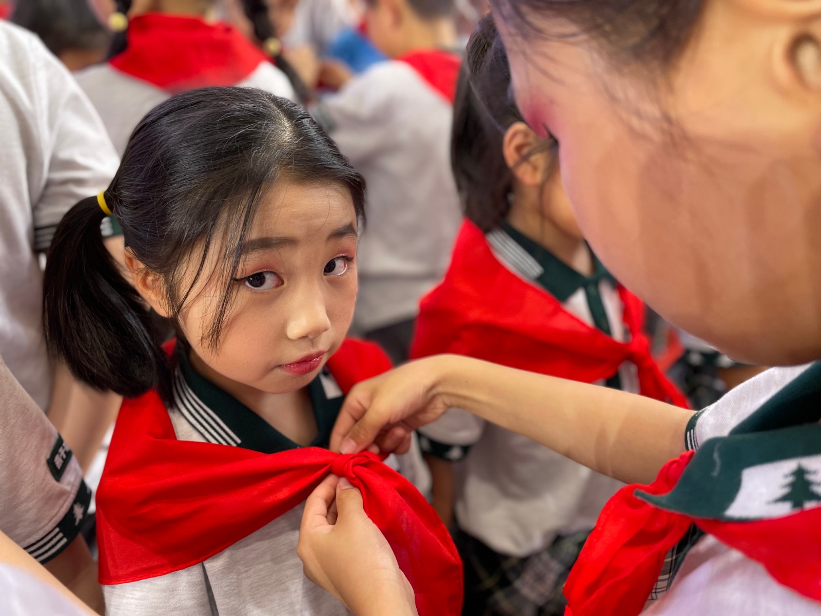 对于新队员们来说,最期盼的时刻莫过于带上鲜艳的红领巾了。在激昂而又轻快的《欢迎进行曲》伴奏下,三年级优秀少先队员代表平托双手,将这美丽而又神圣的红领巾授予新队员。